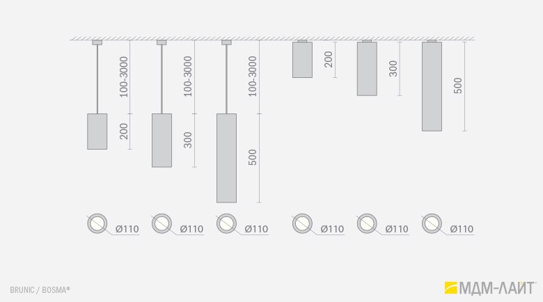 BRUNIC – светильник в форме трубы, окрашенной в два стандартных цвета на выбор: белый и черный. Серия включает три типоразмеров с длинами: 200, 300 и 500 мм.