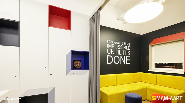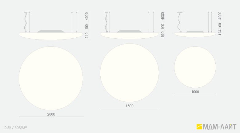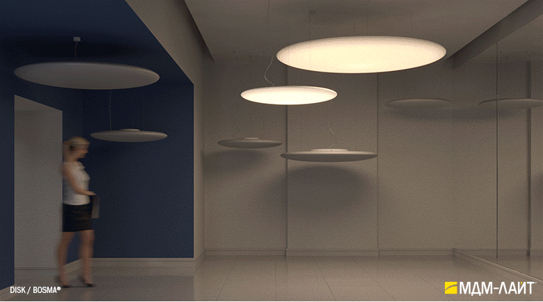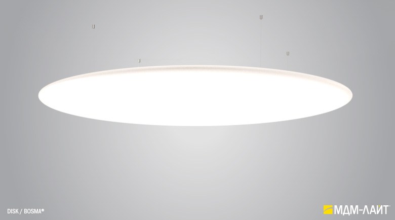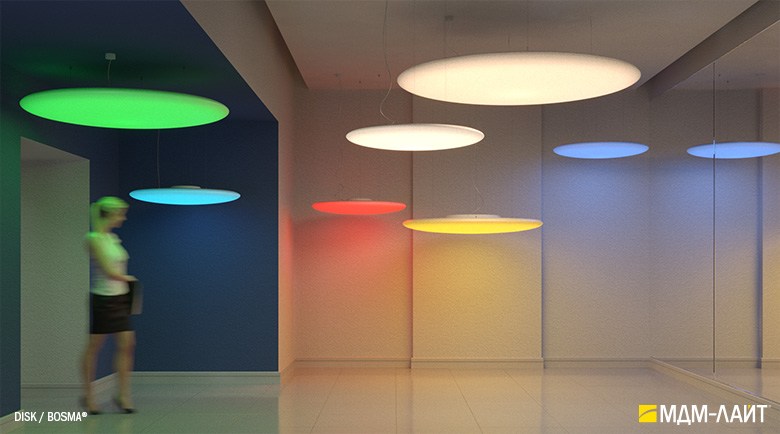 Серия больших светодиодных светильников DISK торговой марки БОСМА круглой дискообразной формы. Высокая интенсивность светового потока благодаря светящейся поверхности внушительных размеров и отличному светопропусканию корпуса-рассеивателя 85-89% (подтверждено испытаниями ВНИСИ). Коэффициент пульсации менее 1% не вызывает зрительной утомляемости. Использование технологии RGB позволяет создавать уникальный световой дизайн, совмещая общий свет с возможностями декоративного освещения. Разработано и производится в России.