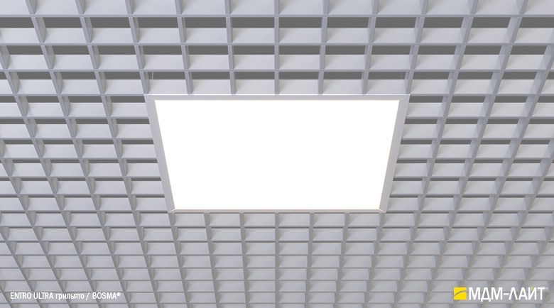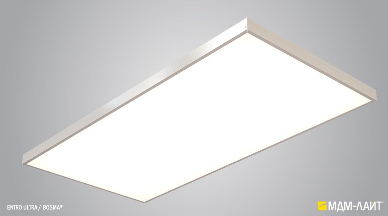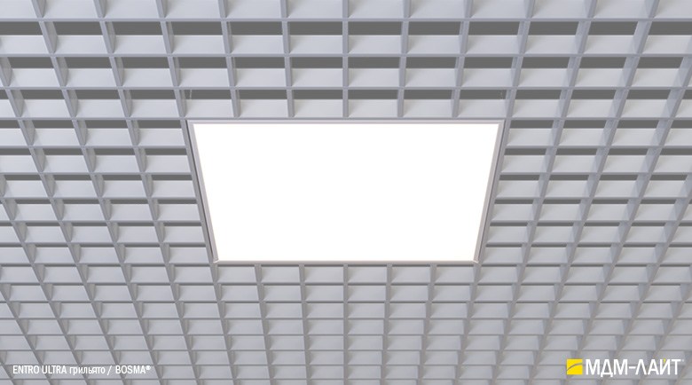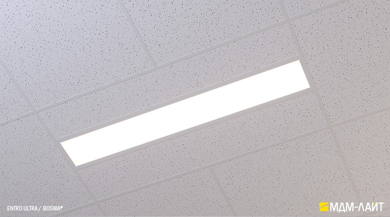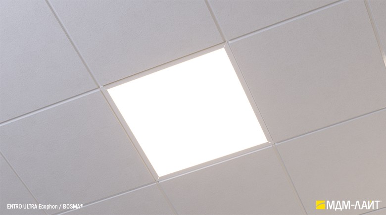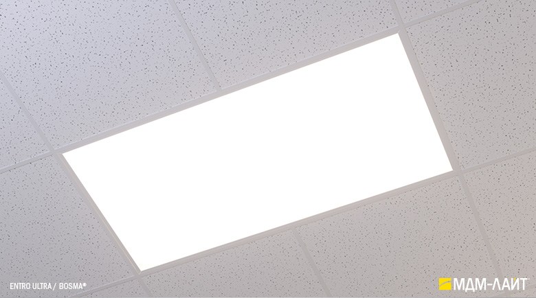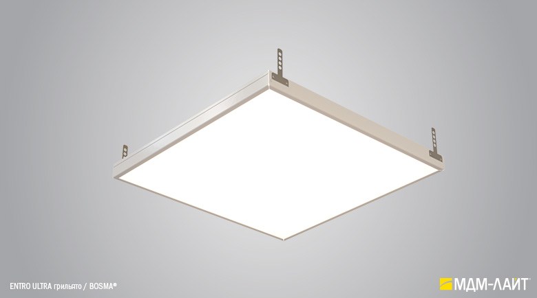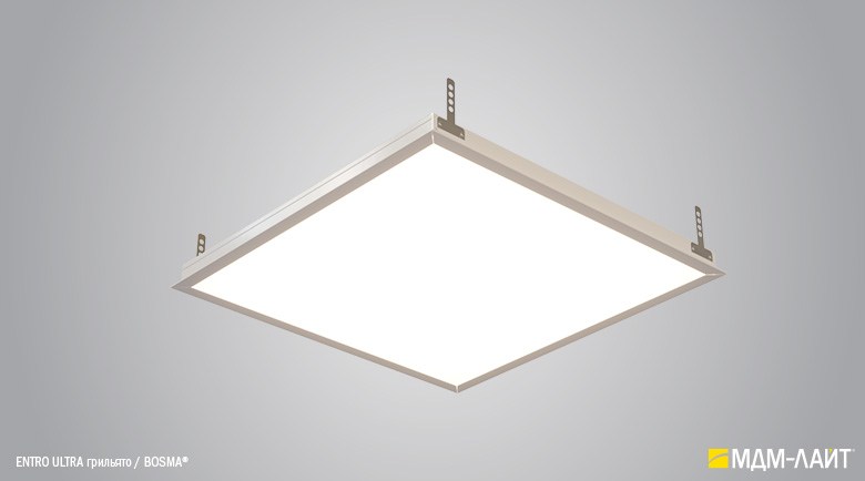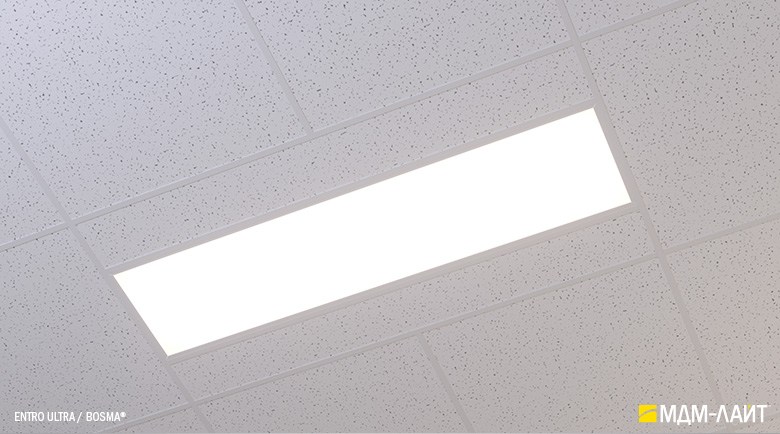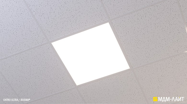 Светодиодные светильники с равномерной засветкой рассеивателя серии ENTRO для подвесных потолков типа «Армстронг» со стандартной ячейкой 595×595 мм отличают простота монтажа и эксплуатации в сочетании с качеством профессионального света. Основное отличие от стандартных светильник в равномерной засветке рассеивателя без видимых полос и точек от светодиодов. Новый конструктив и комплектующие позволяют добиться ровного свечения по всей плоскости рассеивателя. В светильниках этой серии учтены и исправлены все недостатки светильников данного типа, выпускаемых другими производителями.
