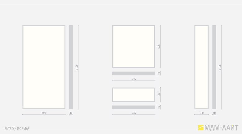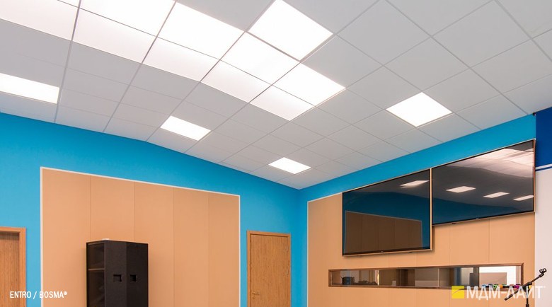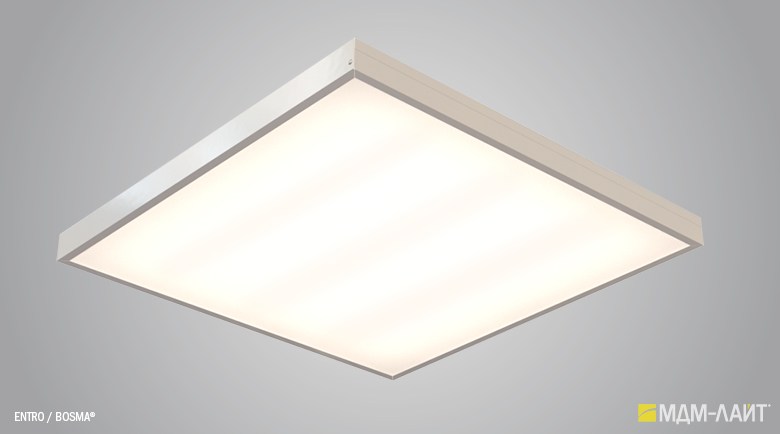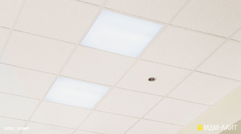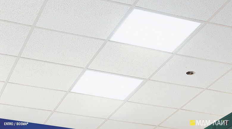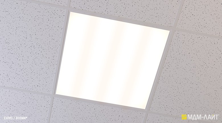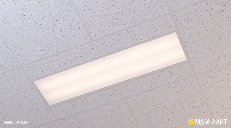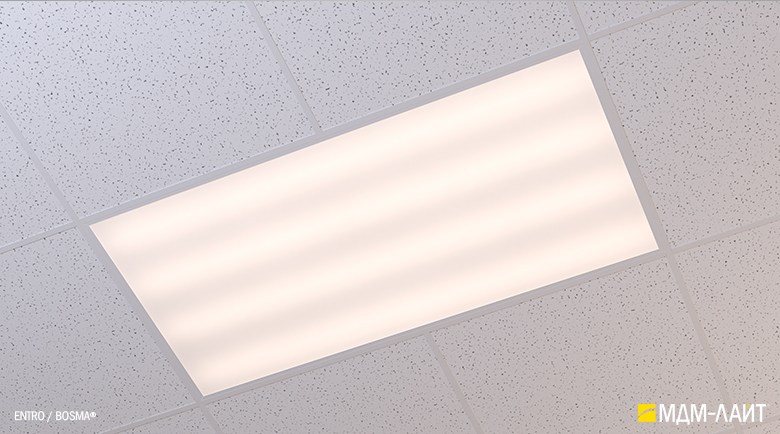 Светодиодные светильники производства компании «МДМ-Лайт» серии ENTRO для подвесных потолков типа «Армстронг» со стандартной ячейкой 595×595 мм отличают простота монтажа и эксплуатации в сочетании с качеством профессионального света. В светильниках этой серии учтены и исправлены все недостатки светильников данного типа, выпускаемых другими производителями.