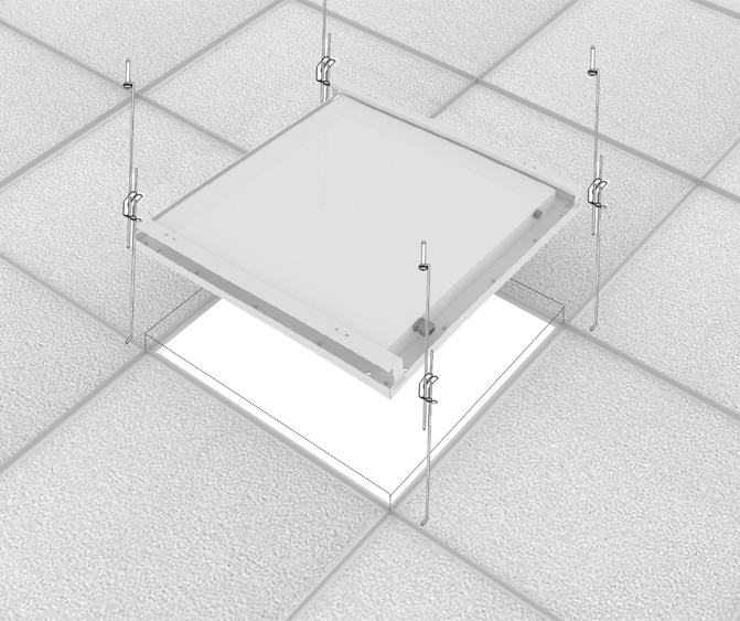 Тип подвеса: накладной, подвесной при помощи тросовых подвесов, установка на потолок Армстронг/Грильято, Clip in