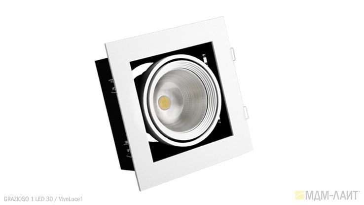 Осветительный прибор модели GRAZIOSO 1 LED 30 представляет собой карданный светильник встраиваемого типа. Его монтаж осуществляется за счет встраивания в подвесные потолки с усиленной конструкцией или гипсокартонные подшивные потолки.