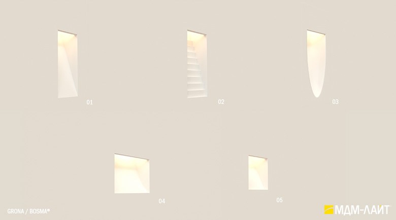 GRONA – серия встраиваемых светильников для потолков и стен, изготовленных из гипса, включающая в себя пять моделей: