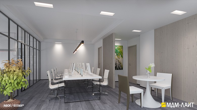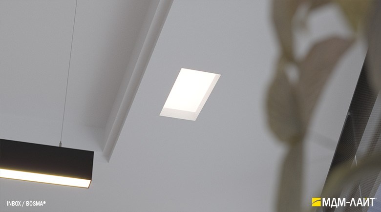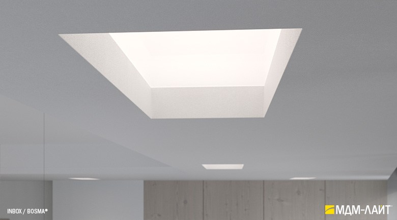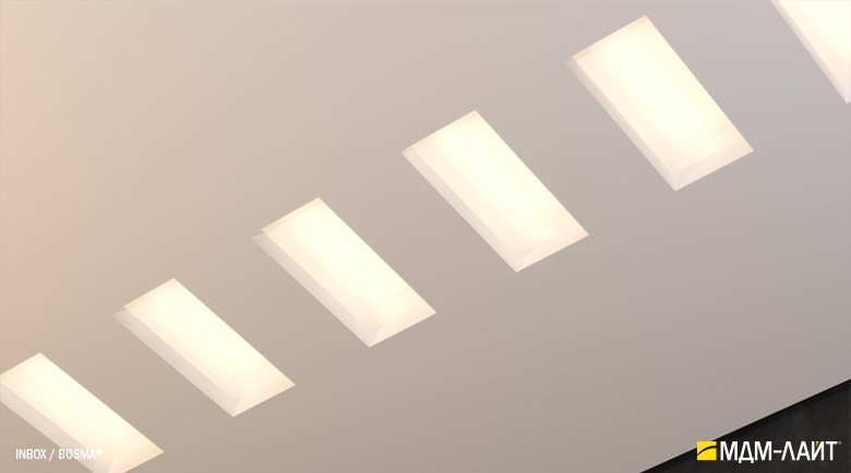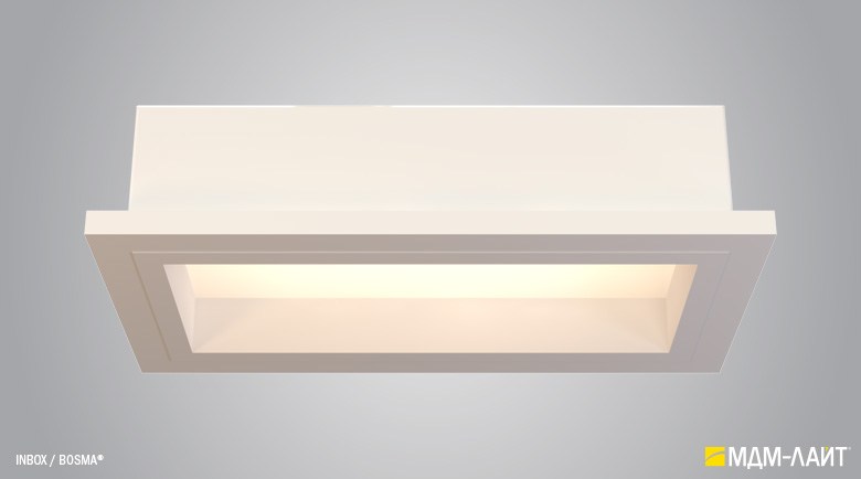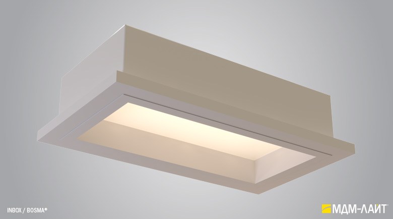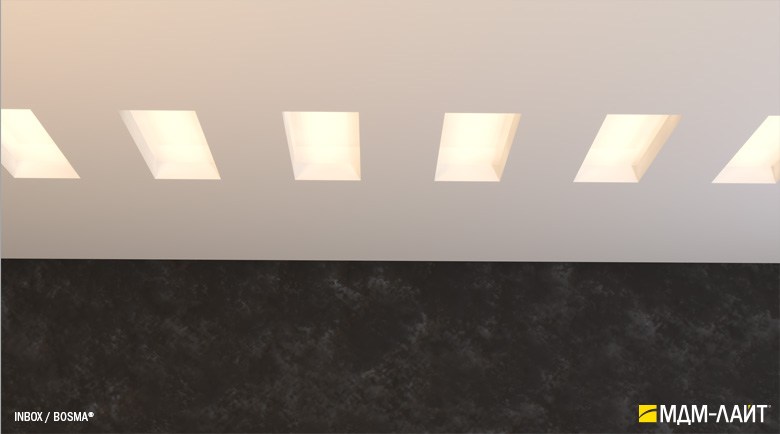Серия гипсовых светильников INBOX торговой марки БОСМА для гипсокартонного потолка. Светильники, встроенные в поверхность потолка, образуют прямоугольные светящиеся полости. Это оригинальное решение для дизайнерских интерьеров, отличающееся элегантным внешним видом и высоким уровнем визуального комфорта освещения.