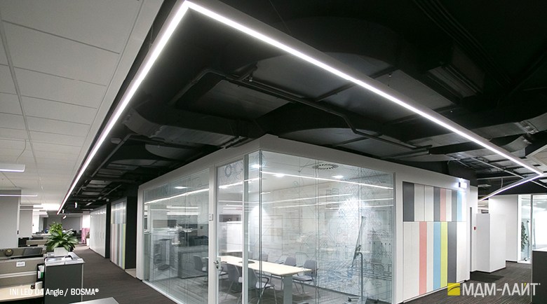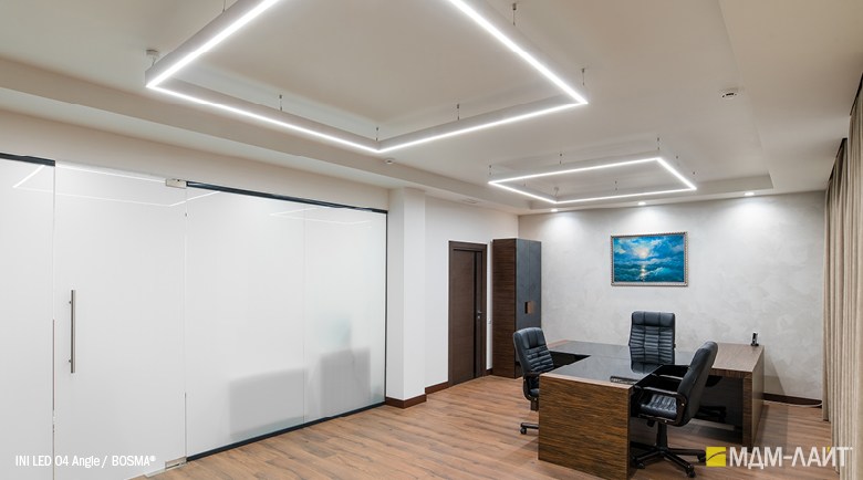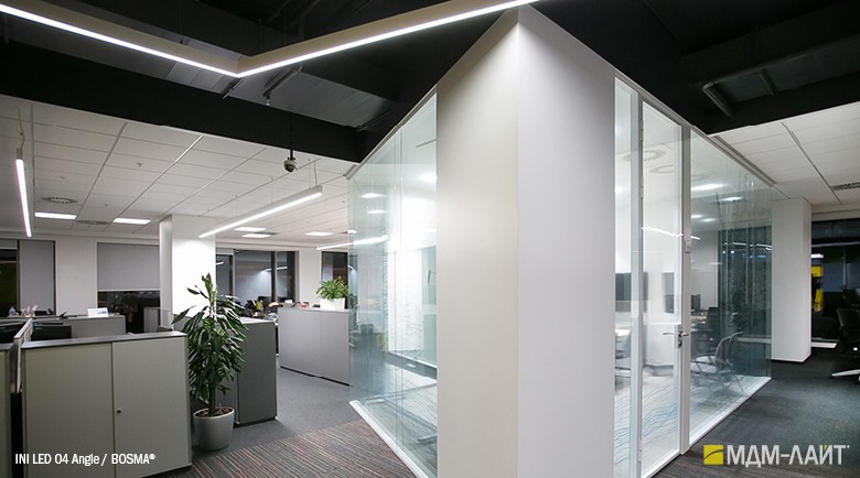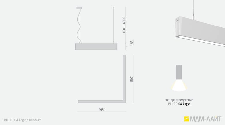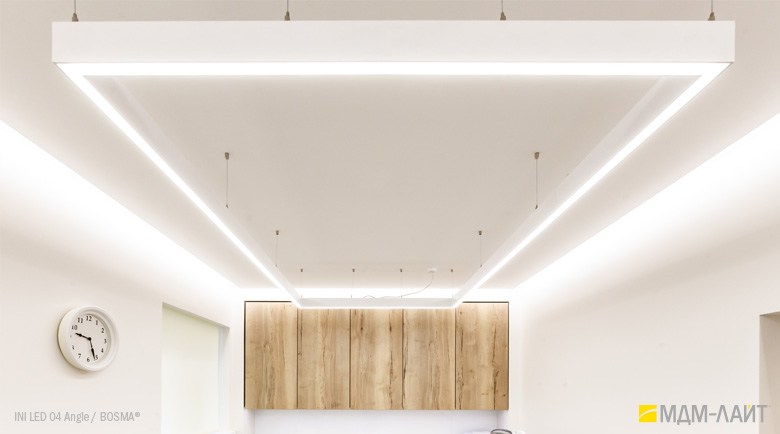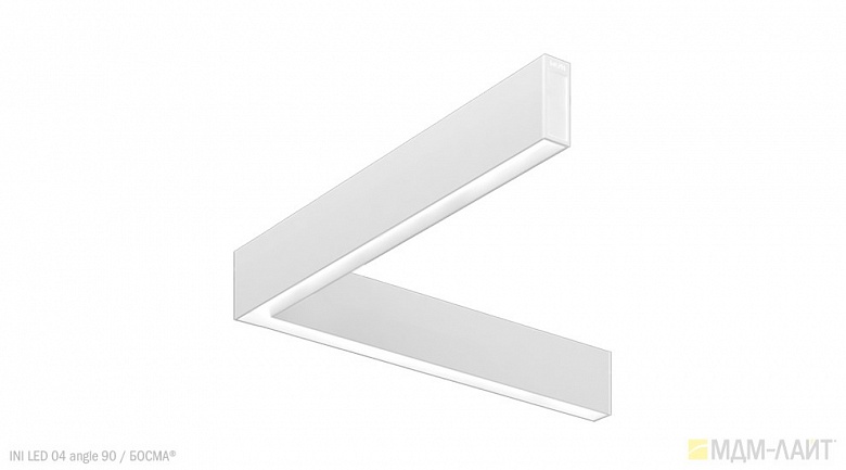 INI LED 04 Angle (торговая марка — БОСМА) — модификация линейного светильника INI LED 04, представляет собой соединение двух светильников мощностью 18 Вт под углом в 90 или 135 градусов. Данная модификация дополняет модельный ряд INI LED для создания более эффективных и оригинальных проектов освещения. INI LED Angle могут выступать в качестве углового соединения для светильников INI LED любой длины.