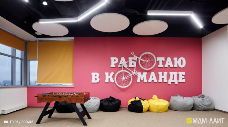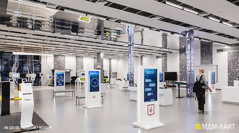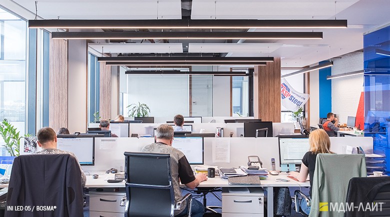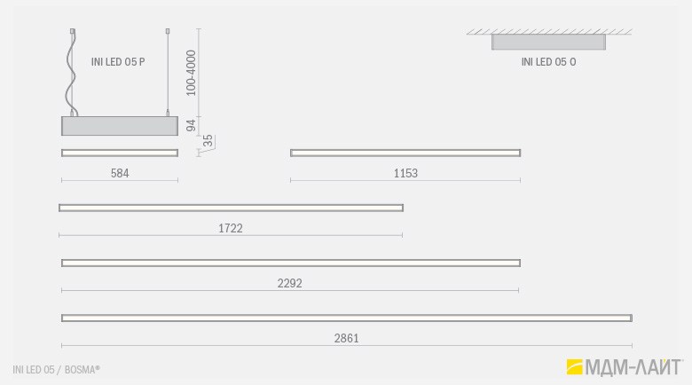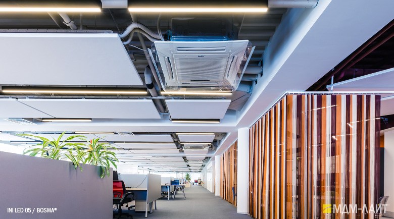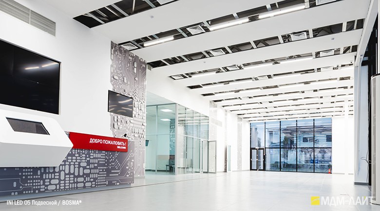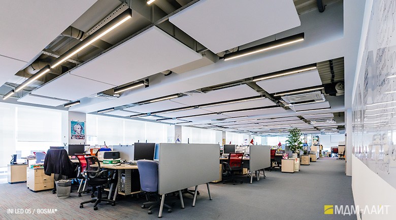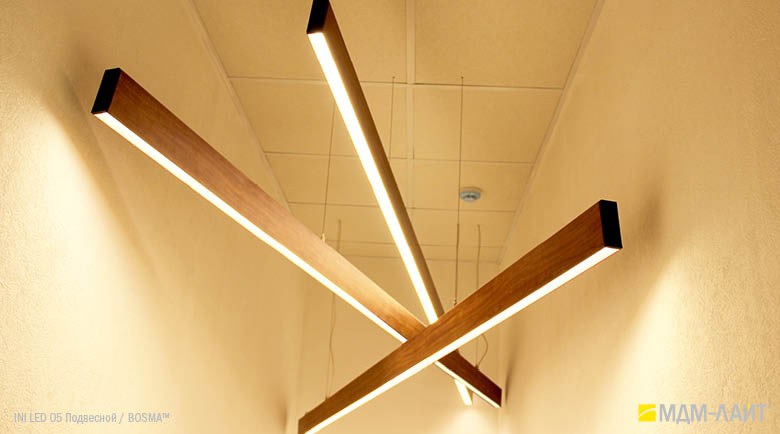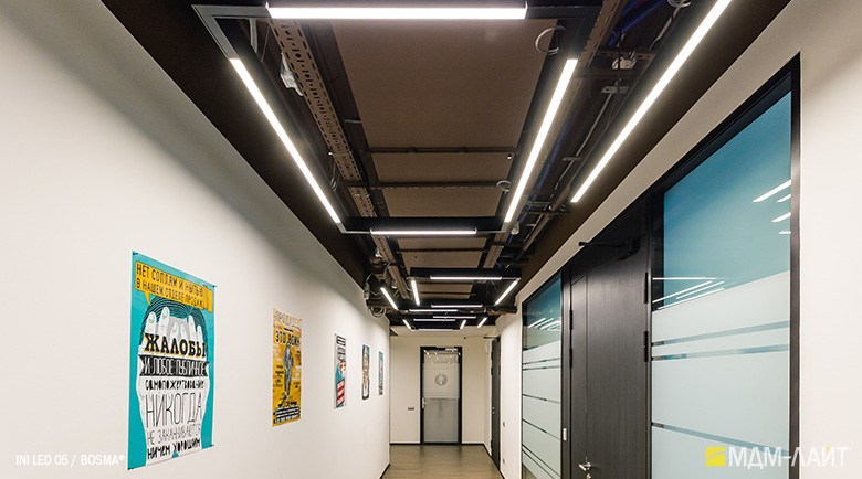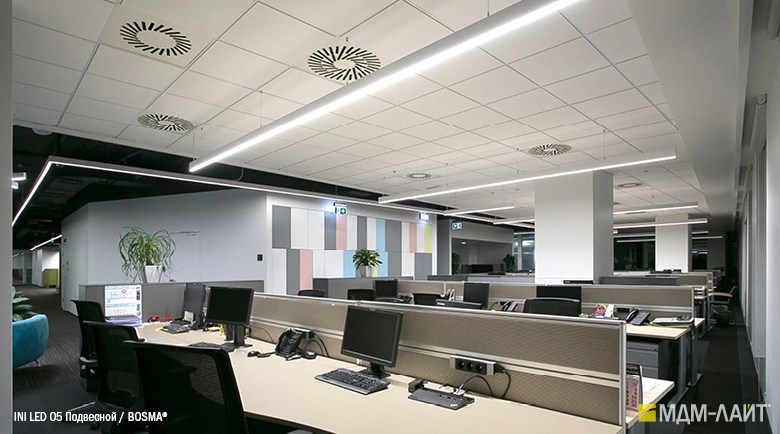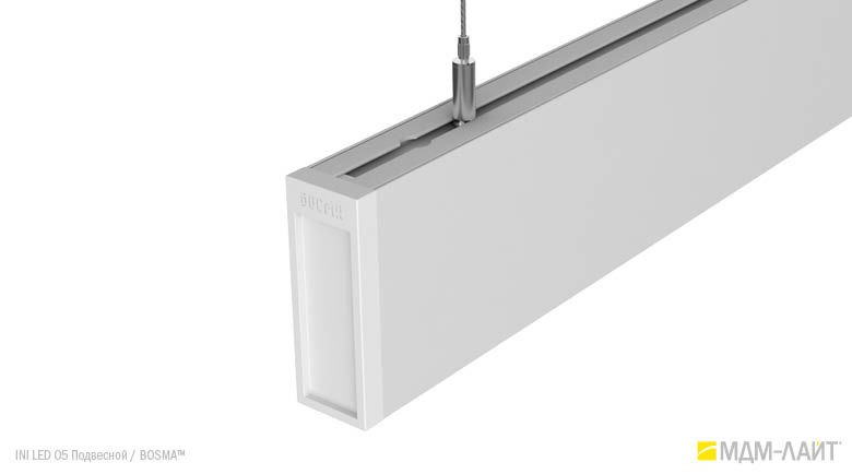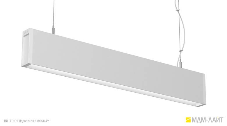 Конструкция светильников серии INI LED 05 позволяет использовать их как отдельные линейные светильники, так и соединять их в непрерывные светящиеся линии и прямоугольные конструкции. Данная модель имеет утопленный в корпус рассеиватель, что изменяет распределение светового потока (74°), направляя его вертикально вниз, делая освещение пространства более мягким и комфортным. Благодаря рассеивателю из поликарбоната световой поток обеспечивает равномерное и комфортное освещение в помещениях с любой высотой потолка.