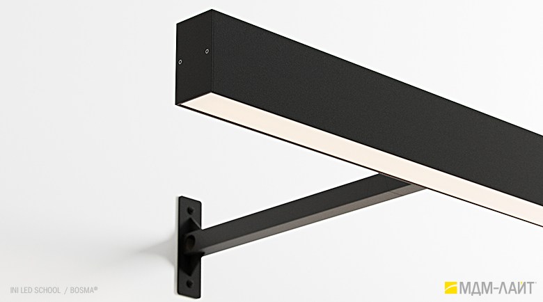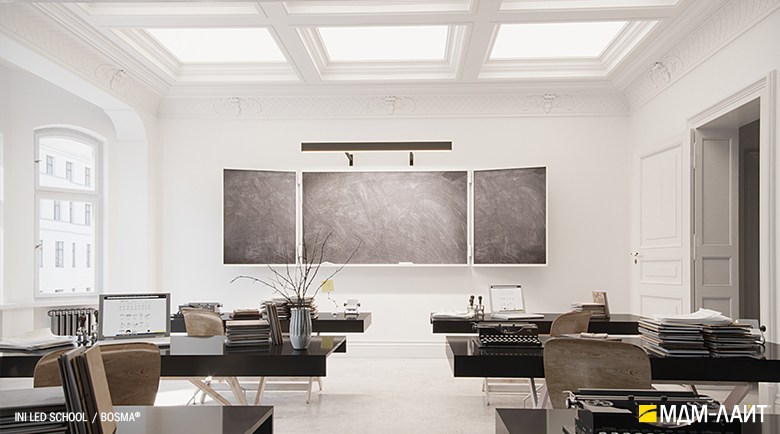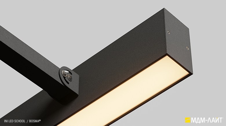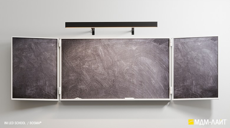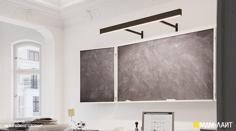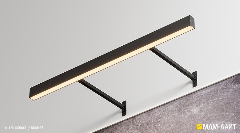 Светодиодный светильник INI LED SCHOOL – накладная модель семейства линейных светильников торговой марки БОСМА (BOSMA). Светильник разработан специально для направленного освещения настенных досок и пространства рядом с ними. Локальная подсветка рабочей зоны преподавателя способствует комфортной работе и акцентированию внимания учащихся.