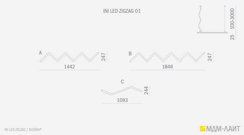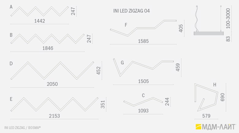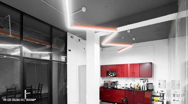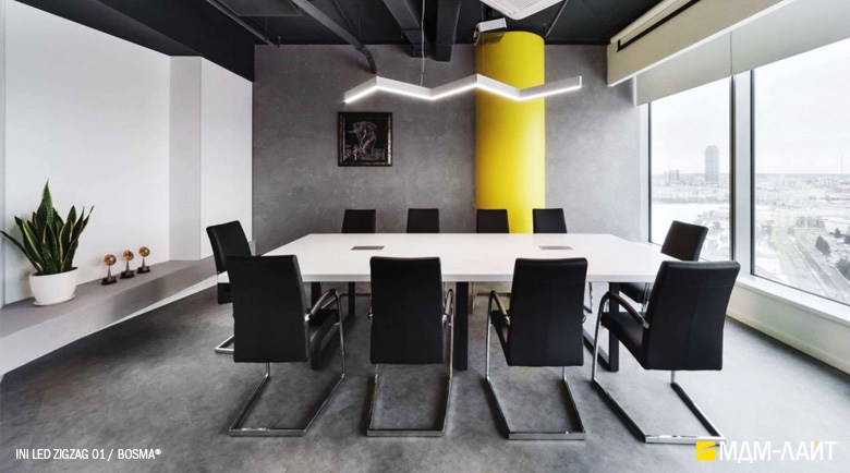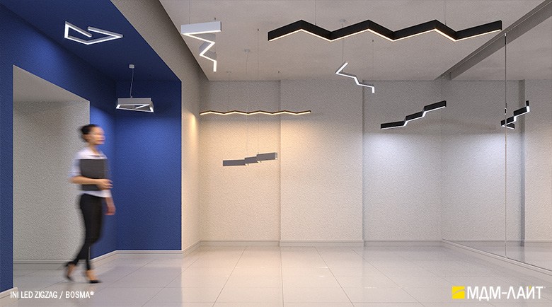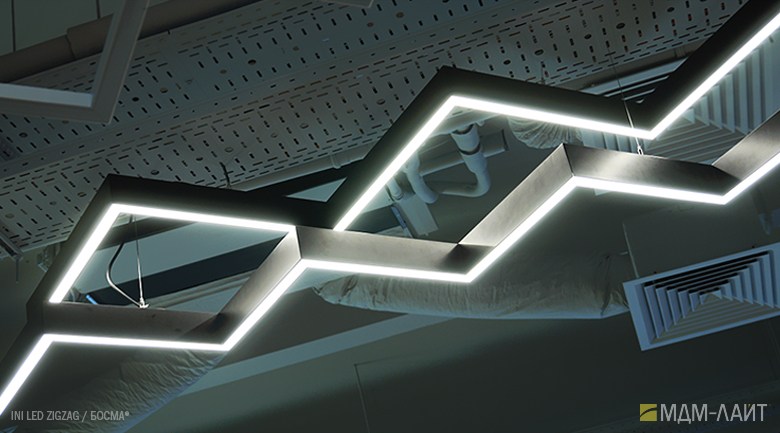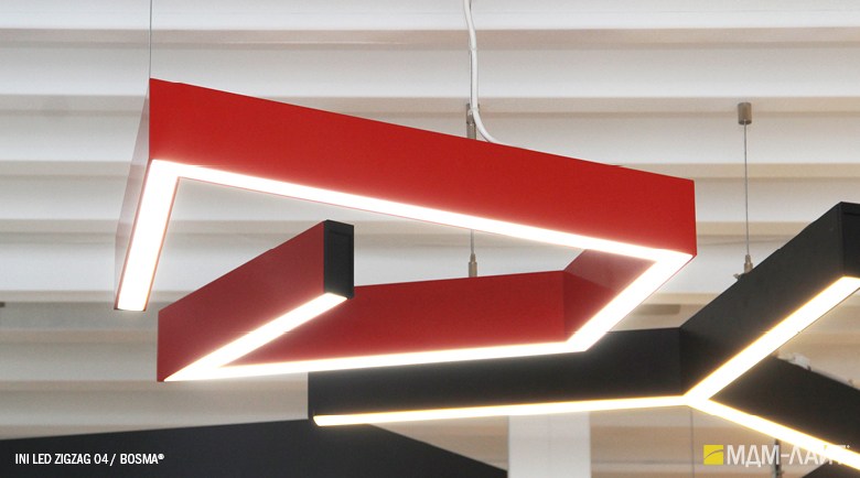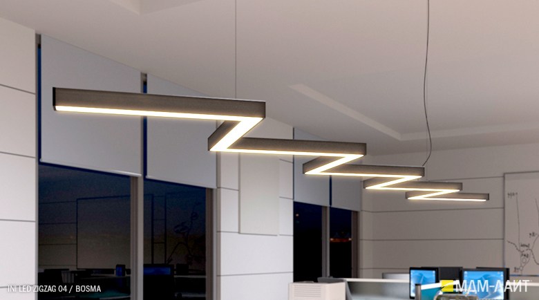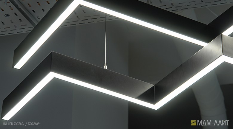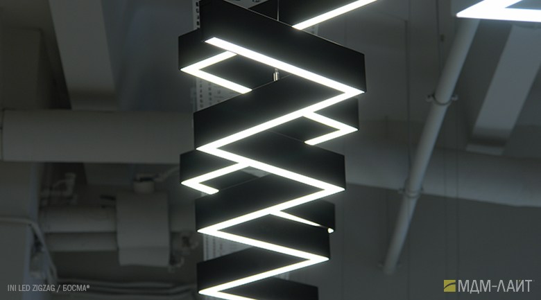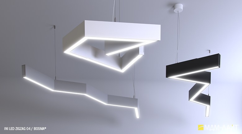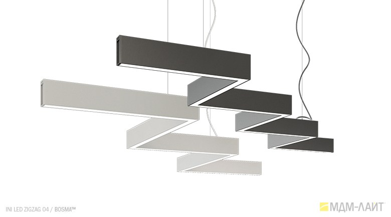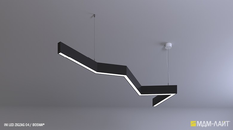 Серия подвесных светодиодных светильников зигзагообразной формы INI LED ZIGZAG 04 на основе подвесной модели INI LED 04 (торговая марка — БОСМА). Каждый светильник является готовым решением и может использоваться как самостоятельно, так и в составе модульной системы (при использовании коннекторов). Линейка включает различные конфигурации, которые можно комбинировать, составляя оригинальные композиции и формируя световой рисунок потолка. Корпус светильника выполнен из алюминия, окрашен порошковой краской. Матовый рассеиватель обеспечивает равномерную засветку без пикселизации. Установка с помощью цанговых подвесов, благодаря которым регулировка высоты осуществляется на самом светильнике, а не в месте крепления на потолке. Это сокращает время проведения монтажных работ и позволяет отрегулировать высоту светильника самостоятельно. Поворотные цанги, выдерживающие большой вес, позволяют надежно подвесить светильник в наклонном положении в составе оригинальной художественной композиции. Разработано и производится в России. Гарантия 3 года.