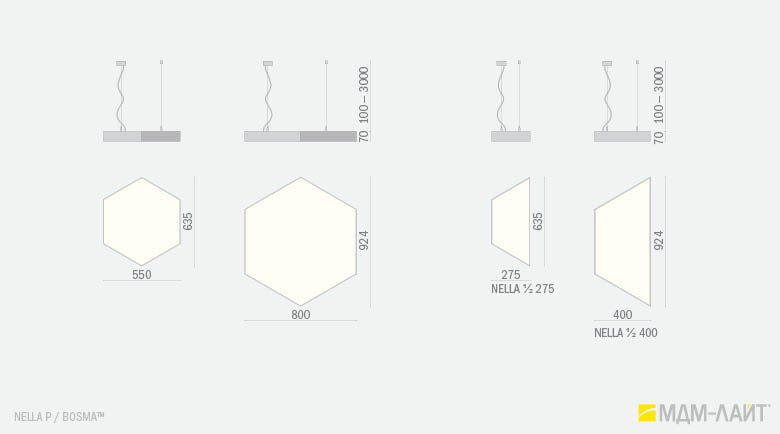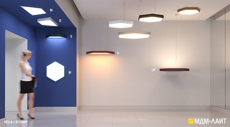 Серия больших светильников в форме шестиугольника и трапеции NELLA. Серия светильников дает широкие возможности для создания световых комбинаций и групп светильников благодаря наличию нескольких типов креплений (подвесные, накладные, встраиваемые) и возможности монтажа на потолок и стену. Рассеиватели светильников серии NELLA имеют высокую степень равномерности засветки. Широкое светораспределение исключает эффект ослепления в помещениях с любой высотой потолка. Светильник разработан и производится в России. Гарантия 5 лет.