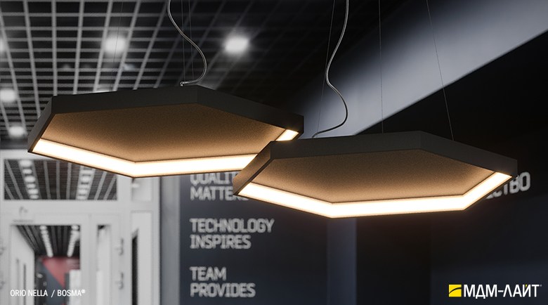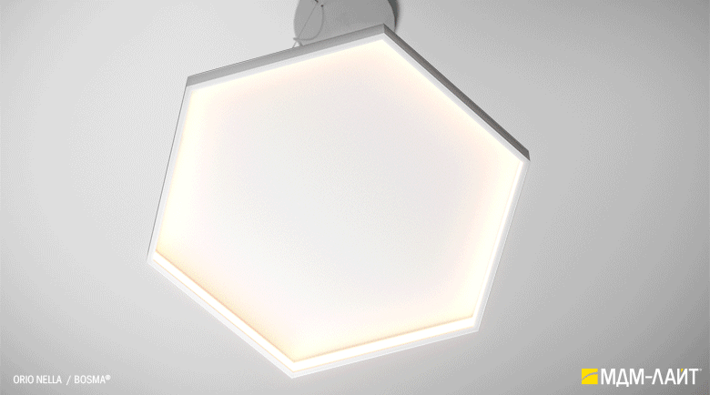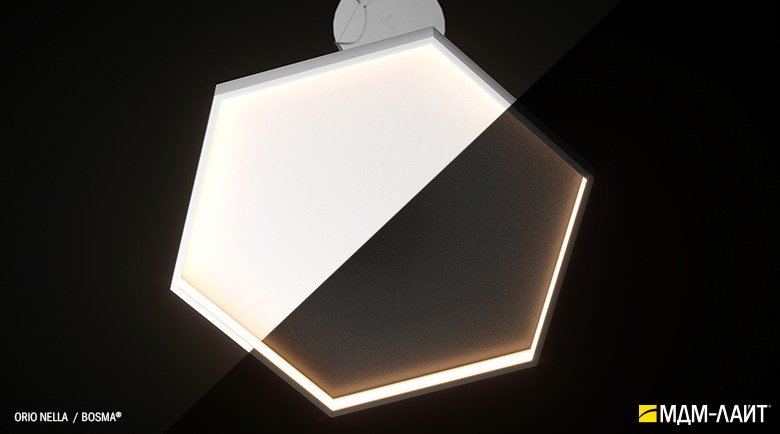 Серия подвесных светодиодных светильников ORIO NELLA (торговая марка БОСМА). Светильник представляет собой пятиугольник толщиной 14 мм и высотой 52 мм. Источник света расположен на внутренней поверхности светильника. Драйвер расположен в декоративном драйвер боксе, с помощью которого осуществляется крепление к плоскости потолка. Светильник поставляется с комплектом регулируемых подвесов.