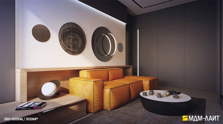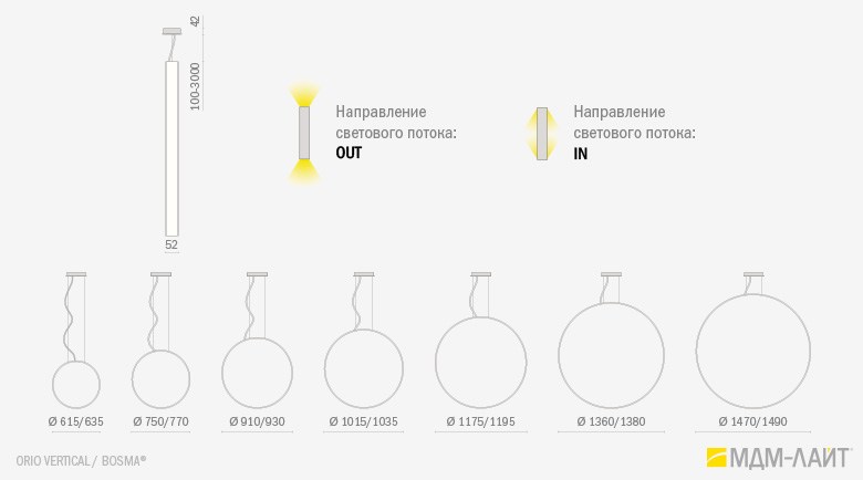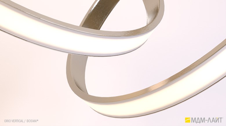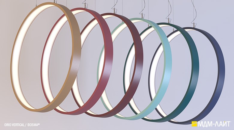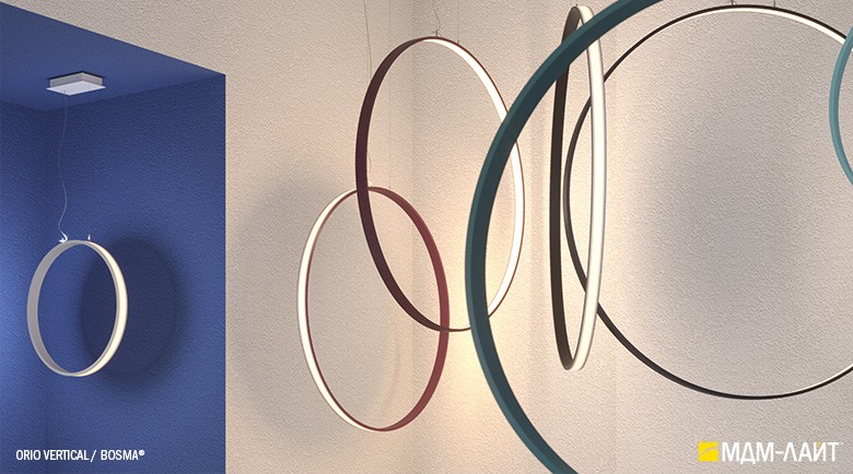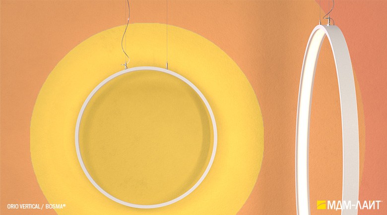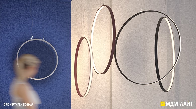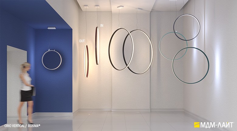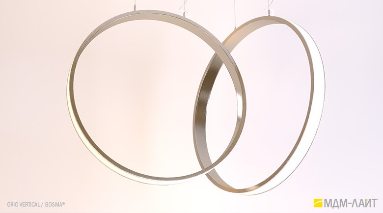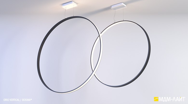 Серия подвесных светодиодных светильников кольцеобразной формы ORIO VERTICAL (торговая марка БОСМА). Светильник представляет собой подвешенное вертикально плоское кольцо толщиной 52 мм и высотой 14 мм. Источник света может быть расположен на внутренней (версия IN) или на внешней поверхности кольца (версия OUT). Драйвер расположен в декоративном драйвер боксе, с помощью которого осуществляется крепление к плоскости потолка. Светильник поставляется с комплектом регулируемых подвесов.