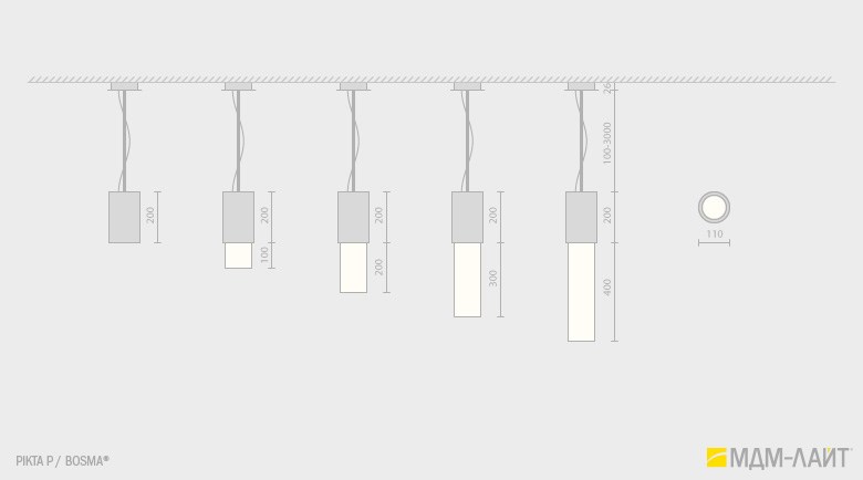 Корпус светильника выполнен из алюминия и поликарбонатного плафона с коэффициентом светопропускания 80%. Источник света – светодиодная лампа (LED) с цоколем Е27. Источник света в комплект не входит. Доступны четыре варианта высоты корпуса: 300, 400, 500 и 600 мм и три варианта исполнения плафона с декоративными накладками снизу — A, B и C.