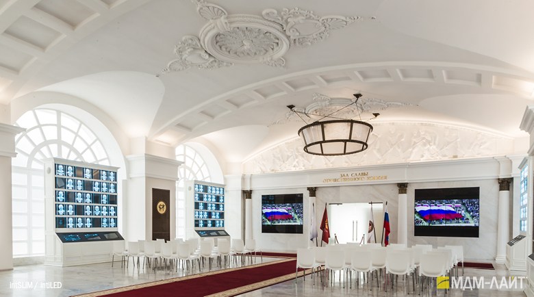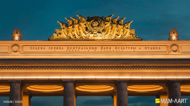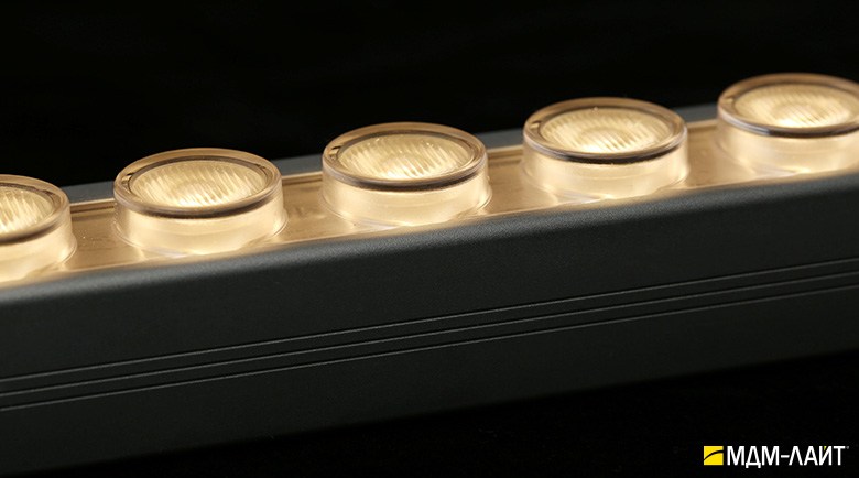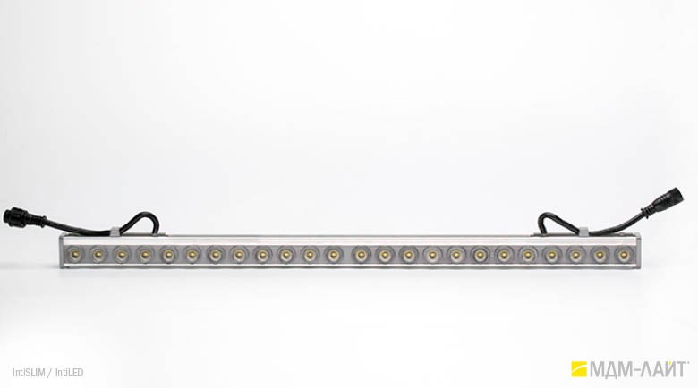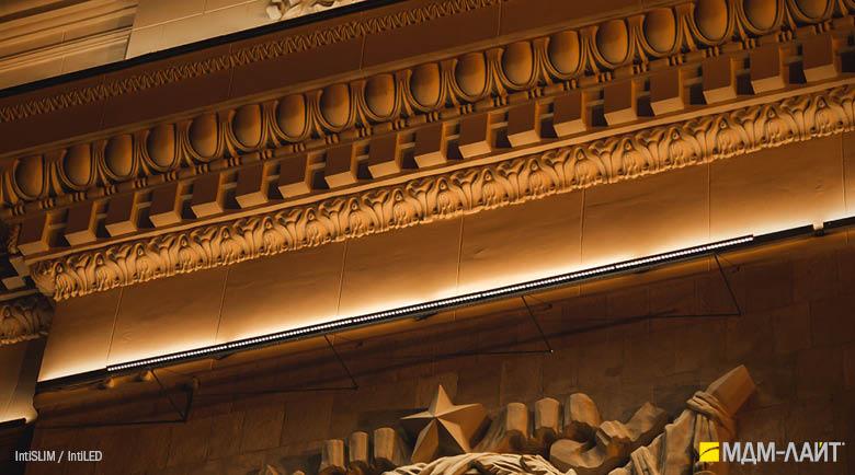 Светильники серии IntiSLIM для архитектурной подсветки фасадов и элементов зданий дают эффект ровной бестеневой заливки светом. Благодаря своим малым поперечным габаритам, данное оборудование можно устанавливать на небольшие карнизы и выступы и оно незаменимо в случаях, когда сами светильники не должны быть заметны на фоне фасада здания.