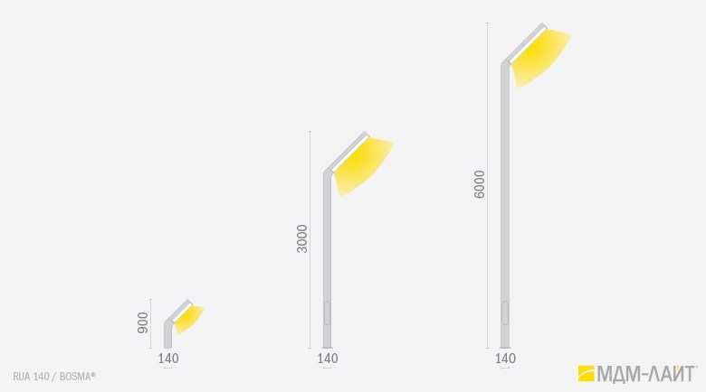 RUA 140 – светильники изогнутой формы с цилиндрическим профилем и боковой засветкой. Голова светильника расположена под углом 45˚ к основанию.