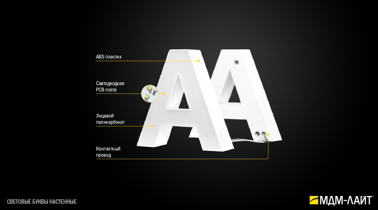 Световые буквы, цифры и символы для настенного монтажа применяются для установки на плоскую поверхность, как внутри, так и снаружи помещений и имеют повышенную степень пылевлагозащиты IP65.Сферы применения: световые вывески, указатели, зоны ресепшн, прилавки, оформление входных групп, уличные и интерьерные вывески, декорирование фотозон, выставки и мероприятия, выносные кронштейны, хэштеги для продвижения в социальных сетях.Корпус букв выполнен по технологии литья под давлением из ударопрочного ABS-пластика, а рассеиватель из поликарбонатного стекла с коэффициентом светопропускания более 75%.
