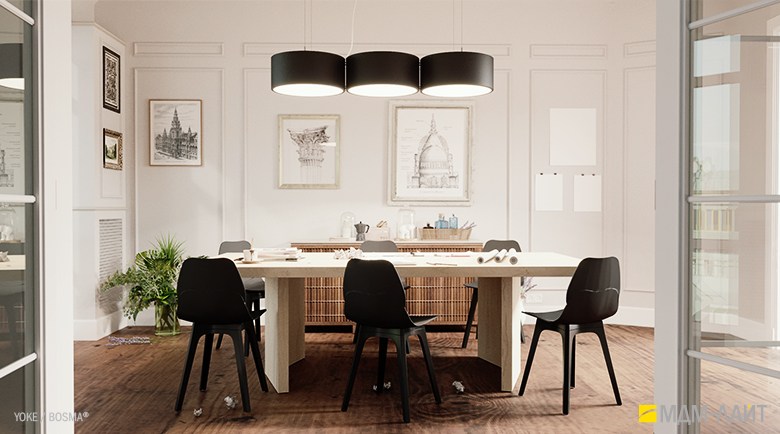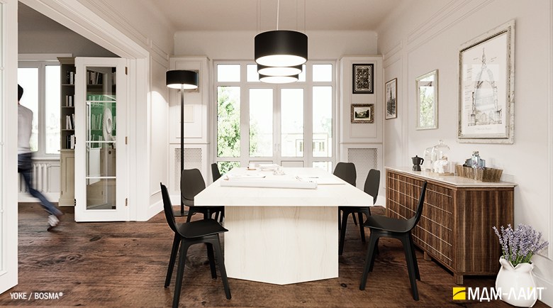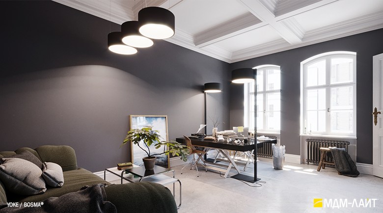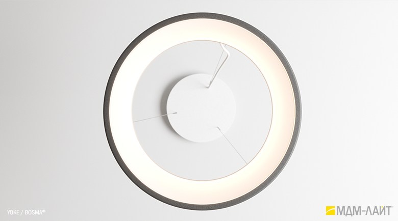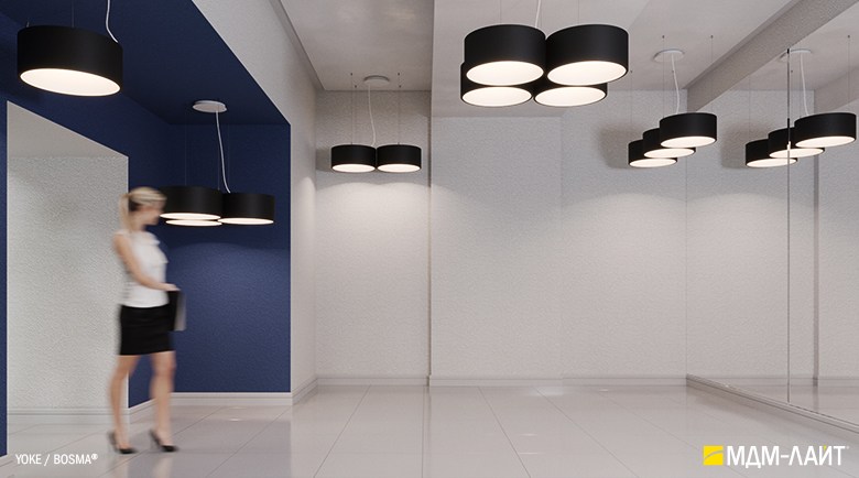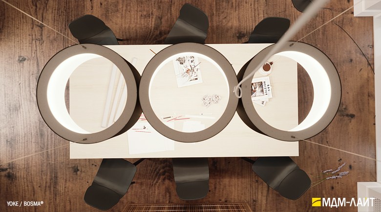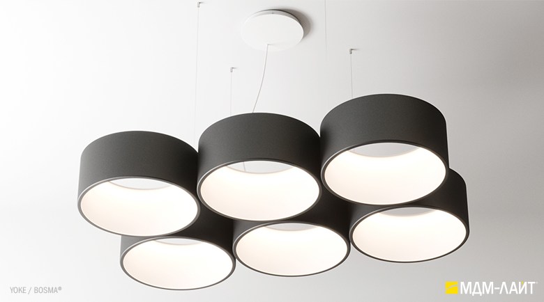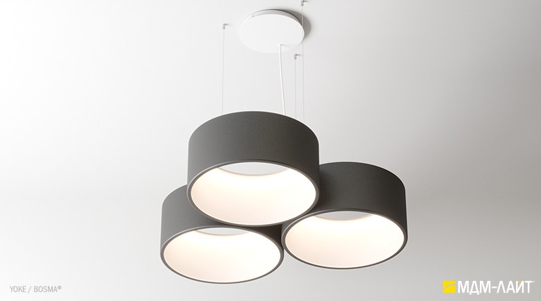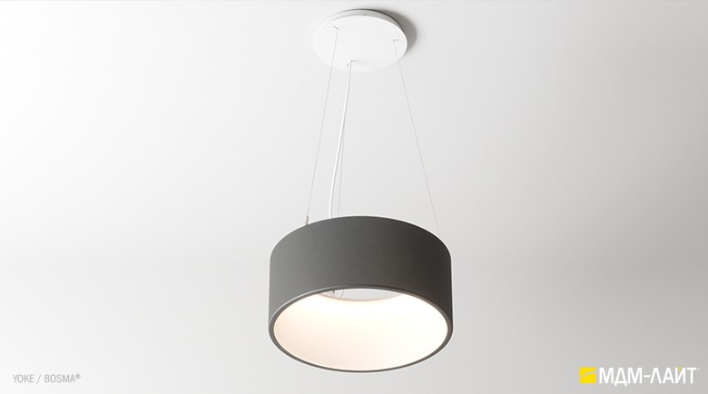 Серия подвесных светодиодных светильников YOKE (торговая марка БОСМА). Основа серии YOKE – новый кольцевой светильник, имеющий цилиндрическую форму корпуса. Внутренняя поверхность светильника из рассеивающего поликарбоната выполнена в форме усеченного конуса. Опаловый материал рассеивателя создает равномерно светящуюся поверхность светильника и комфортную, рассеянную световую среду.